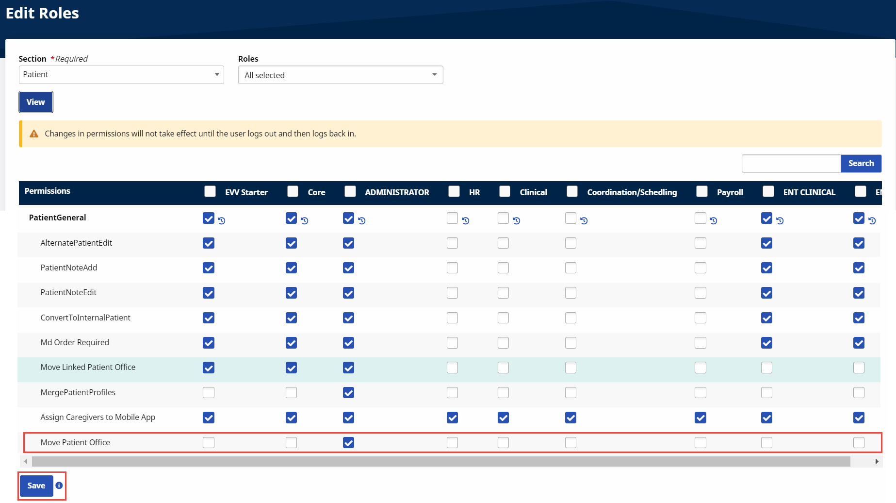 Once the feature is activated for the agency and available in the portal, Providers must assign role permissions for users who use the feature. Refer to the Patient Office Move Permissions section for details.
