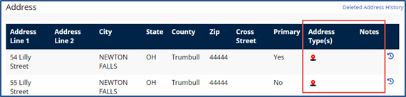 All entered Addresses appear under the Address section. The locator icon under the Address Type(s) column indicate that the address is GPS enabled. Under the Notes column, a note icon indicates if the address has a note attached.