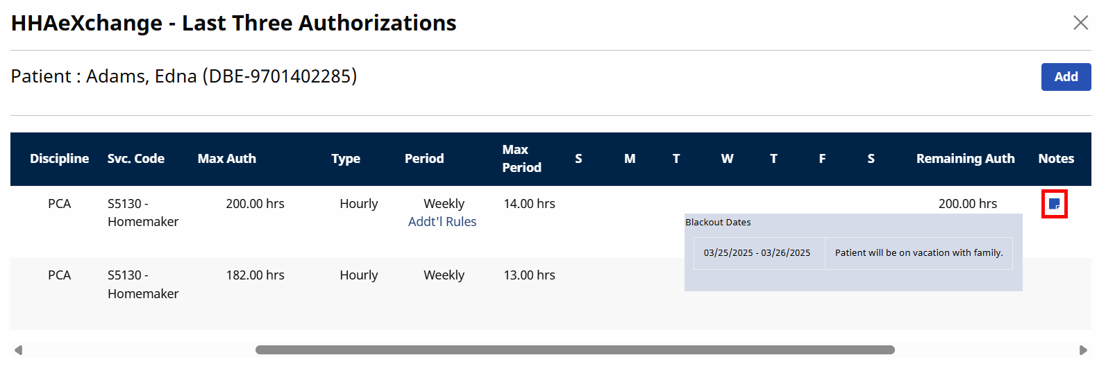 On the Auth/Orders page, hover over the Notes icon to view the Blackout Dates pop-up with information.