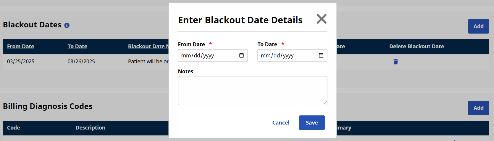 On the Blackout Date Details window enter or edit the From/To Date fields and click Save. Make sure to also click Save on the Patient Authorization window to save the changes.
