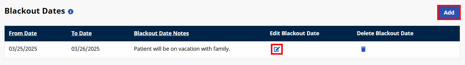 Under the Blackout Dates section, click the Add button to add a Blackout Date range or click the Edit icon to update existing information.