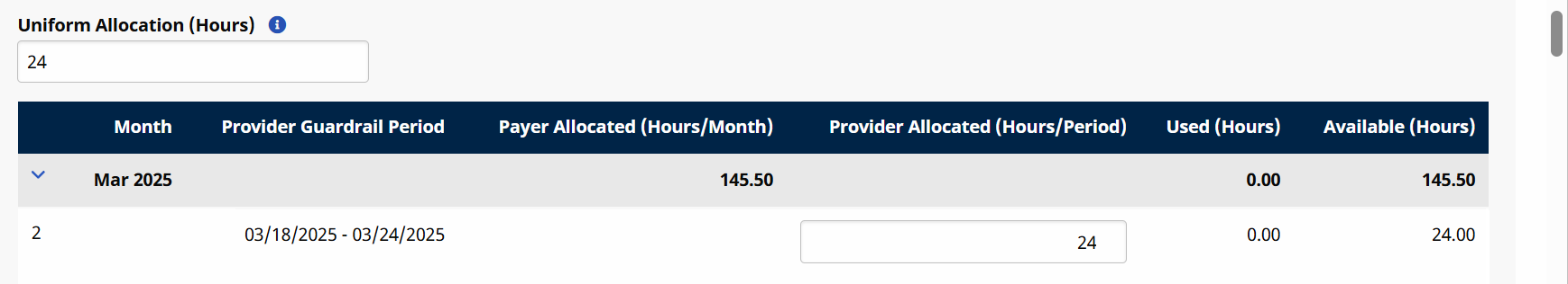 Enter the quantity in the Uniform Allocation (Hours) of hours to divide between the current and future Provider Guardrail Periods.