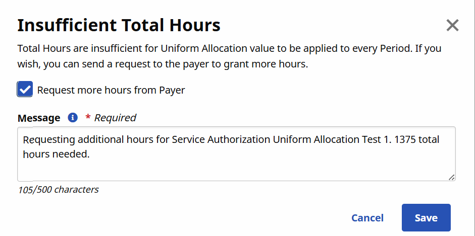 If you run out of allocated hours, you can send the Payer a request for more hours. After you enter the hours in the Uniform Allocation (Hours) field, select Save. The Insufficient Total Hours box displays. Select the Request more hours from payer check box, add a message, and then select Save.
