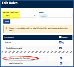 Agency Admin Users must have the Clinical Access Configuration permission selected to restrict and/or assign Patient-specific access. To enable, go to Admin > User Management > Edit Roles. Select Admin from the Section dropdown.