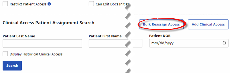 Use the Bulk Reassign Access functionality to update multiple access records/details in one transaction. This is typically useful when either a user (such as a Nurse) leaves the organization and the Patients must be reassigned; or, when workloads are redistributed. Click the Bulk Reassign Access button to reassign multiple Patient access records.