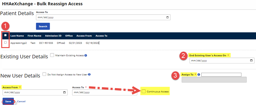 The Bulk Reassign Access window opens. The Access To date filter specifies the effective date for the change with a list of Patients for the defined date. Complete the following steps: