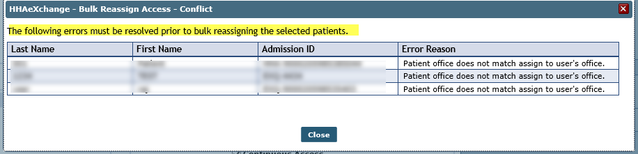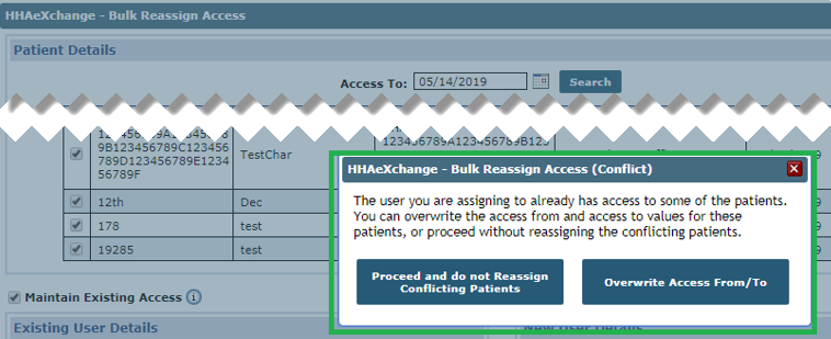 If a user already has Patient access upon a reassignment, then the pop-up appears alerting the user of the conflict.