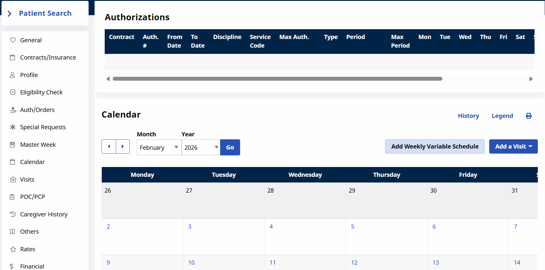 The system applies the EVV and duties to the scheduled visit on all of the Patient Calendars.