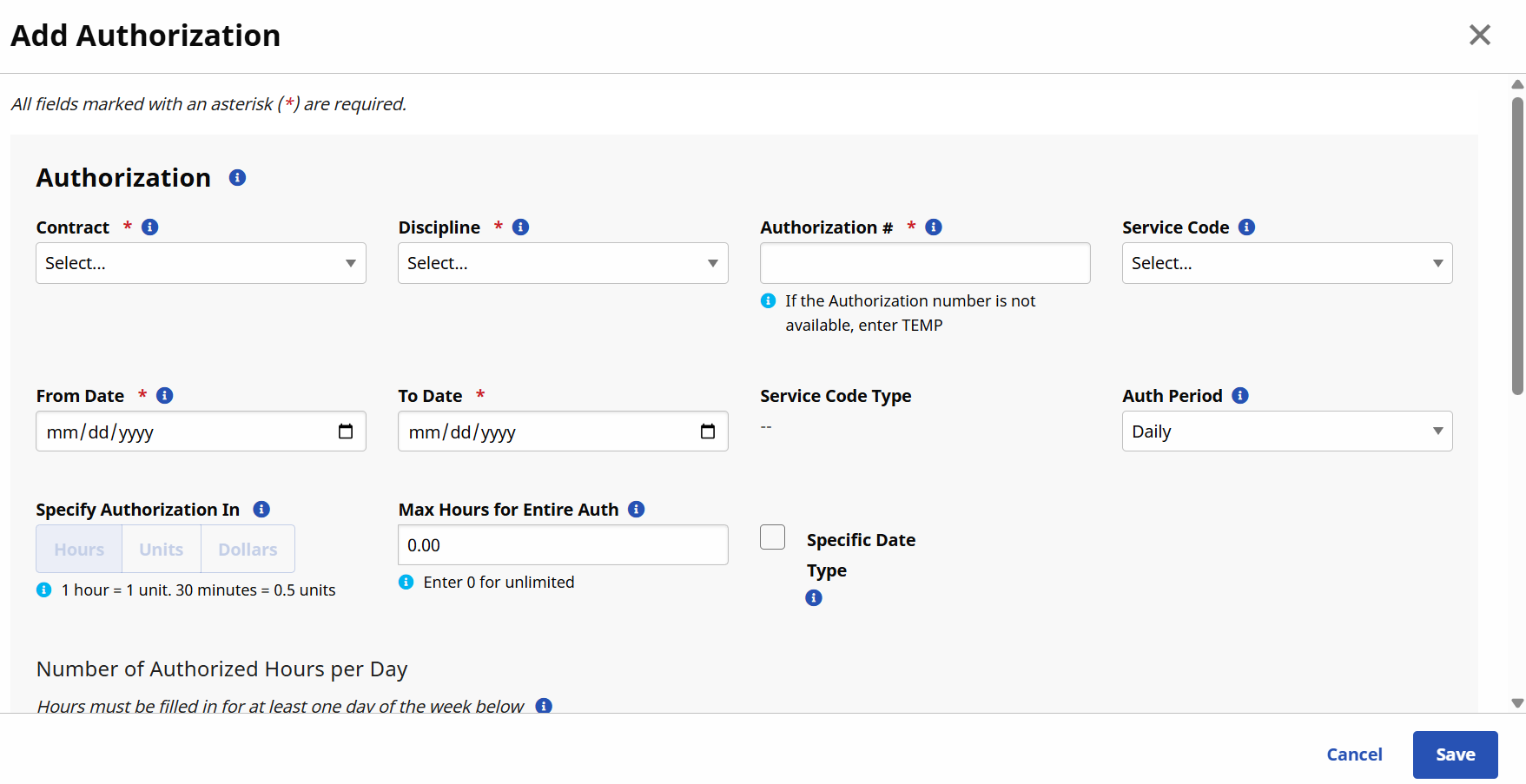 In the Add Authorization window, complete the required fields. Enter a Service Code that is set up for Cluster Visit.
