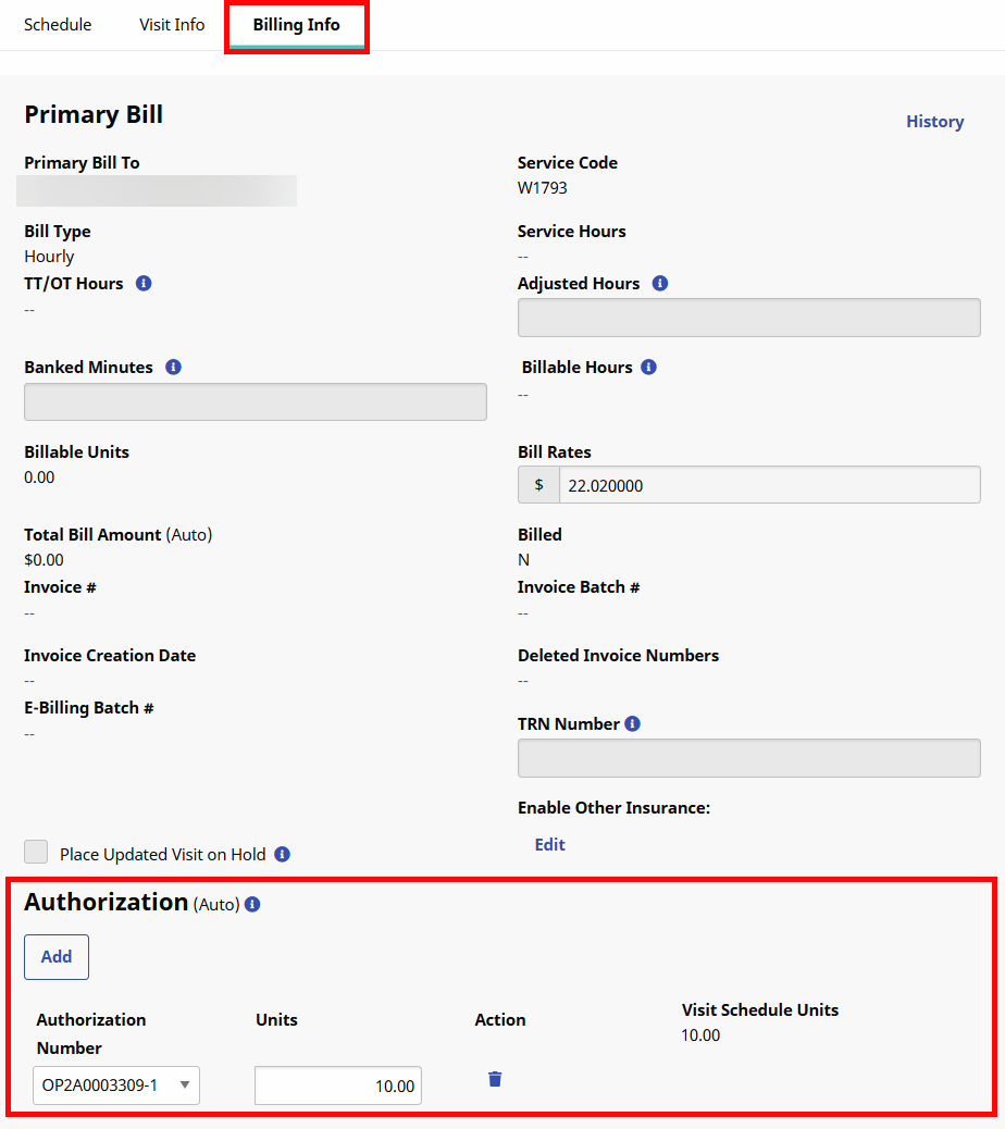 Agencies may review and edit Authorizations automatically applied to Scheduled Visits on the Visit Billing Info tab.