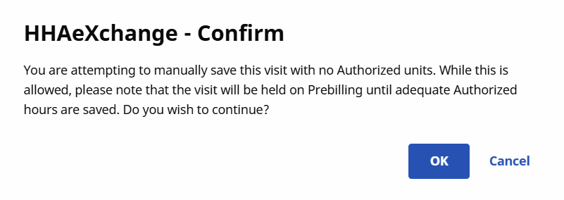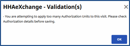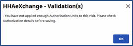 Over or under applying Authorization Units to a visit results in a validation error. For example, if a single Authorization Unit is applied a to a visit scheduled for 2 hours, one is only authorizing a single hour of the visit. In the other hand, applying 3 Authorization Units to a 2-hour visit authorizes an hour of non-scheduled service.