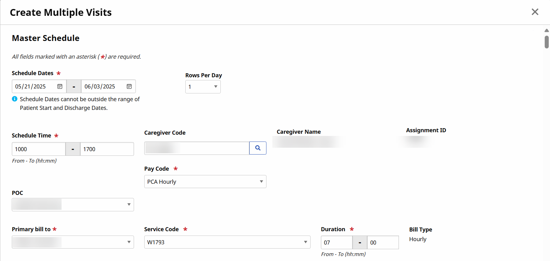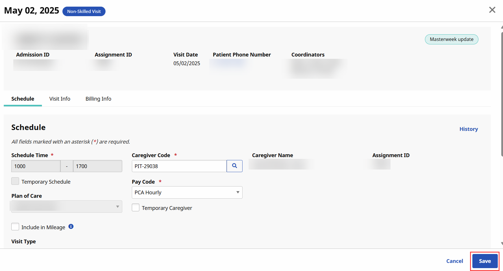 The Non-Skilled Schedule window opens on the visit Schedule tab. Complete the required fields and click Save.