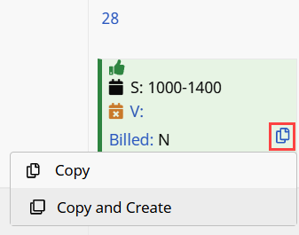From the Patient’s Calendar page, click the Copy/Copy and Create icon in the Calendar day cell and select Copy and Create.