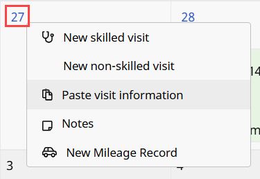 Click the calendar date link in the desired Calendar day cell and select Paste visit information.