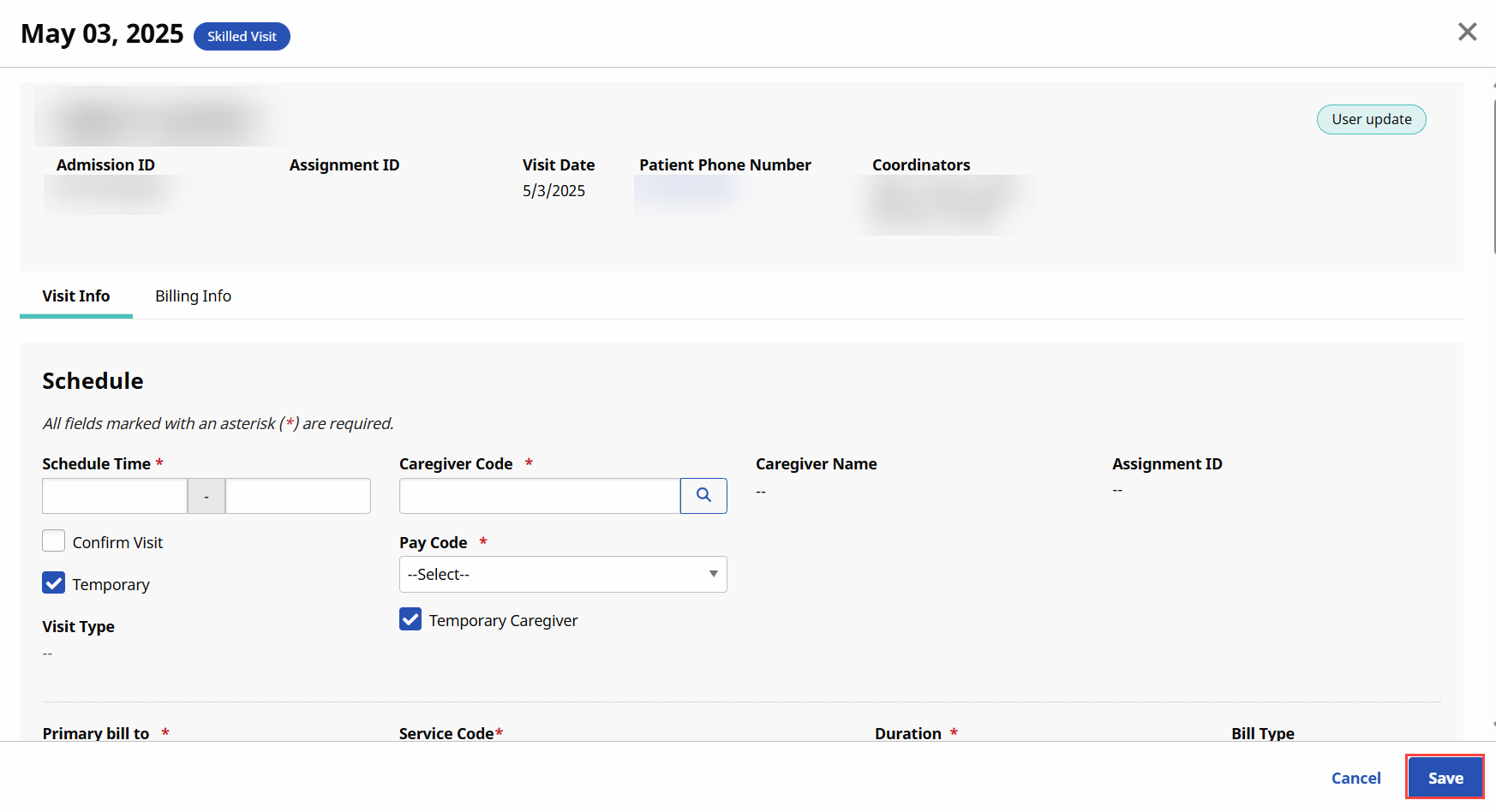 The Skilled Schedule window opens on the Visit Schedule tab. Complete the required fields and click Save.