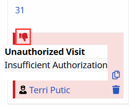 A visit may have multiple un-authorization reasons. Hovering over the icon shows a single reason at a time. If corrected, then the second reason displays.