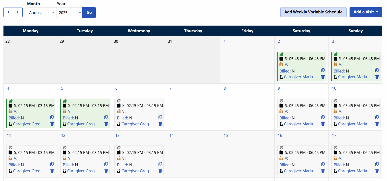 The Master Week rollover length can be customized to view and coordinate visits (schedules) on a monthly basis according to Authorization calculations. Because the Master Week rollover length may be adjusted for each Contract, the system needs to validate scheduled visits based on the Contract settings.