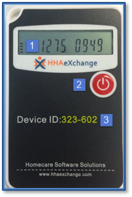 The FOB (Fixed Object) device is used to place secure and accurate EVV. When the power button is pressed, the FOB displays an encrypted 8-digit passcode which reflects the current date and time. Two codes, one generated at the start of the visit and one at the end, are required to place EVV using the FOB.