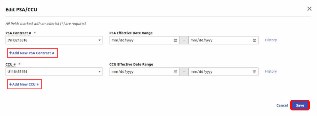 Click the + Add New PSA Contract # link and select the contract number from the dropdown.