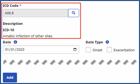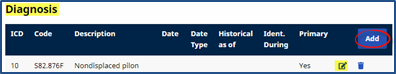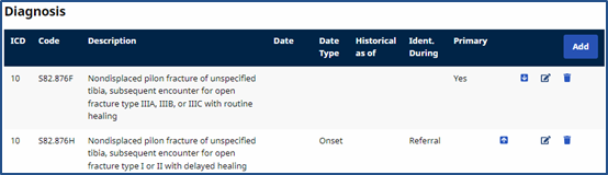 Click the Add button to add a diagnosis or the Edit icon to update an existing diagnosis information for a Patient.