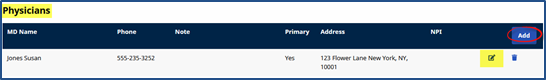 Click the Add button to add a Physician or the Edit icon to update Physician information.