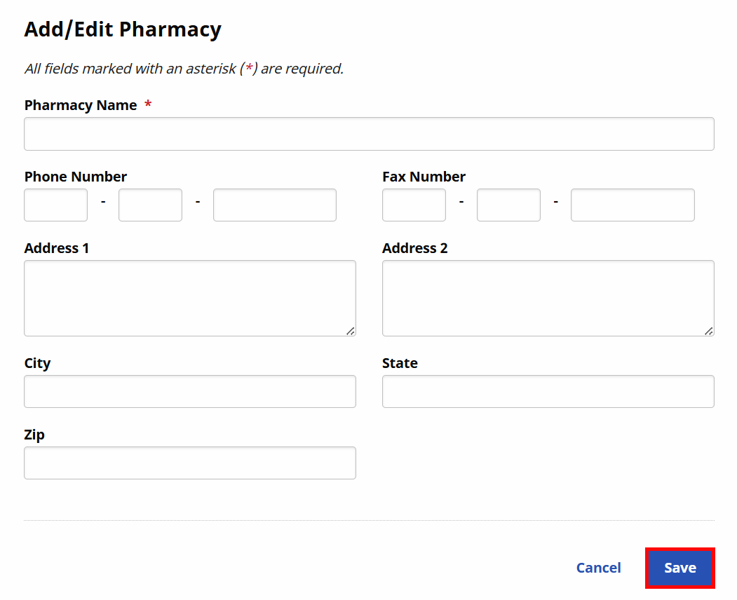 The Add/Edit Pharmacy window opens. The Pharmacy Name field is required. Complete other applicable fields. Click the Save button to apply to the Patient’s profile.