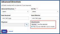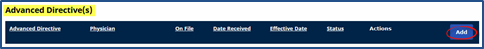 The Advanced Directives section houses any instructions and documents provided by the Patient such as DNRs and Living Wills. The following table provides guidance on how to add or edit an Advanced Directive.