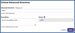 Complete the fields in the Clinical Advanced Directives window. The Advanced Directive field is required. Click the Save button.