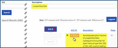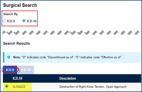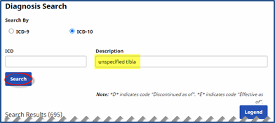 The ICD-10 radio button is selected for this example. Select the ICD-9 radio button to search in the legacy database.