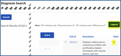 The Diagnosis Search window contains an ICD Code Flags column. A Legend (button) is available to review the meaning of each flag at any time.