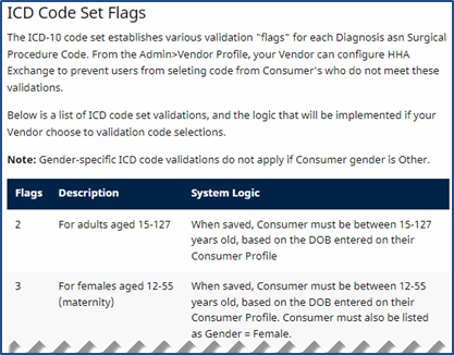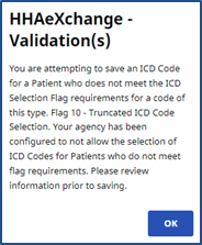 Agencies can set a validation requirement for ICD Codes on the Agency Profile page using the Validate ICD Code Selections field. This validation reviews ICD Code flags, or requirements associated with each code, to ensure that it can be applied to the selected Patient based on specific information (such as age or gender).