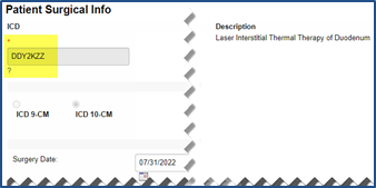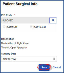 The system routes back to the Patient Surgical Info window. The selected ICD Code displays in the field with the description of the surgical procedure. Complete the remaining (optional) fields. Click the Save button to record.