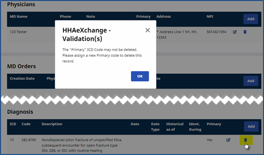 A Primary ICD Code must be assigned as required in the system. Users are restricted from deleting an ICD Code assigned as the Primary Code. When attempting to delete a Primary ICD record, the system issues a validation alert stating that another ICD Code must be assigned as a Primary before deleting the selected Primary Code.
