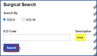 In the Surgical Search window, enter the Patient’s condition in the Description field, select the ICD code database to search, and click the Search button.