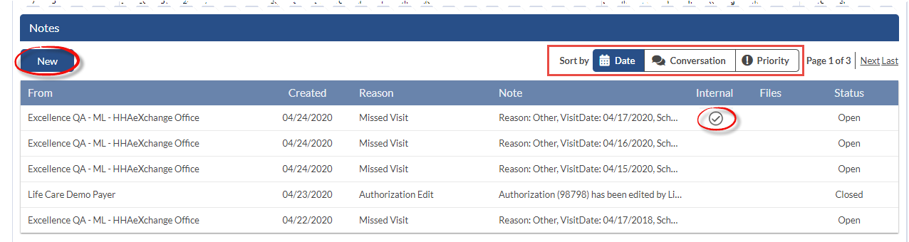 The Patient column does not display while an Internal column is visible. Notes with an encircled Checkmark icon indicate that the Note is Internal (only applicable within the Agency.