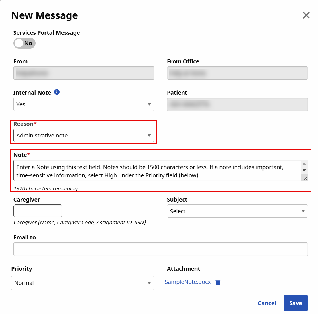 By default, Normal is selected. Select High if the Note is of an urgent matter. Priority messages are denoted with a red alert symbol.