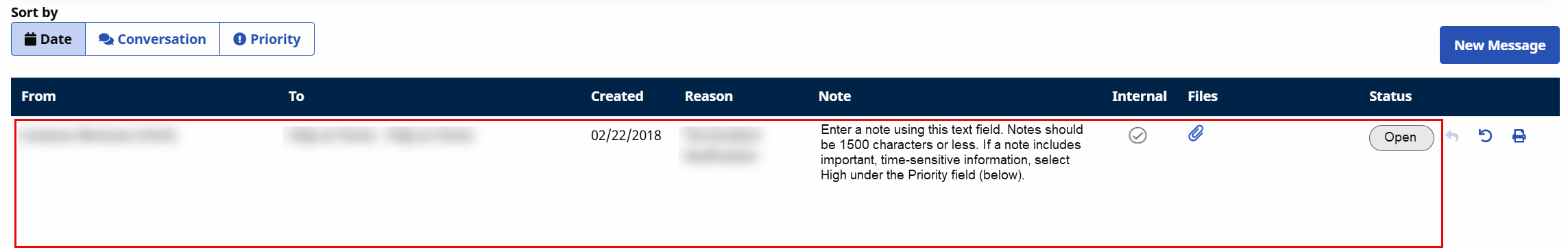 Users can sort by Date, Conversation, and Priority. The Conversation mode allows users to view all replies to the original message. Refer to the Conversation Mode section of the Communications Message Center topic for further details.