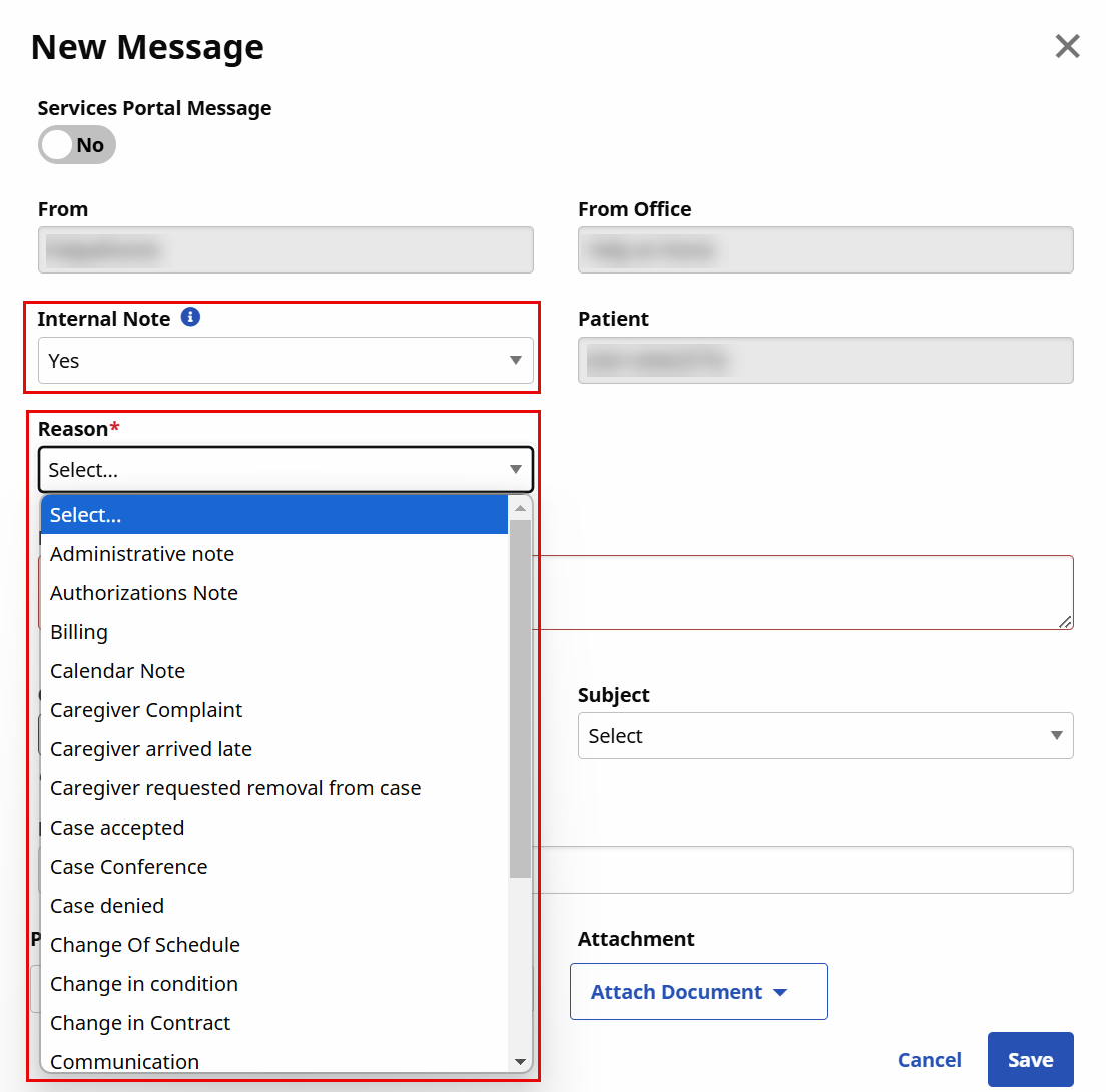 Selecting Yes in the Internal Note field when creating a Patient Note provides a list of Reasons defined by the Provider via the Patient General Notes Reasons Reference Table.
