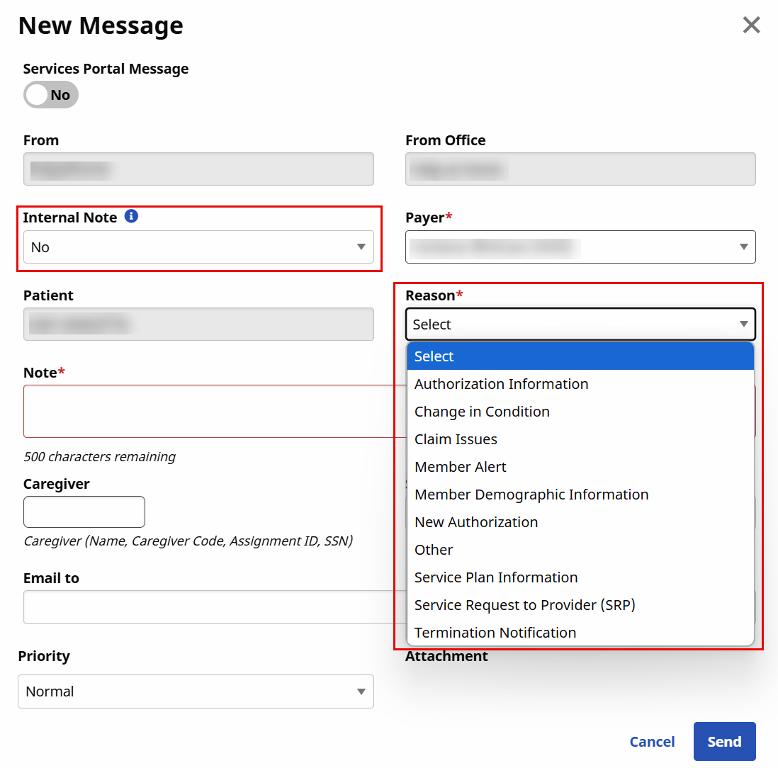 Selecting No in the Internal Note field provides Note Reasons defined by the Payer under the Reasons field via the Notes Reasons Reference Table.
