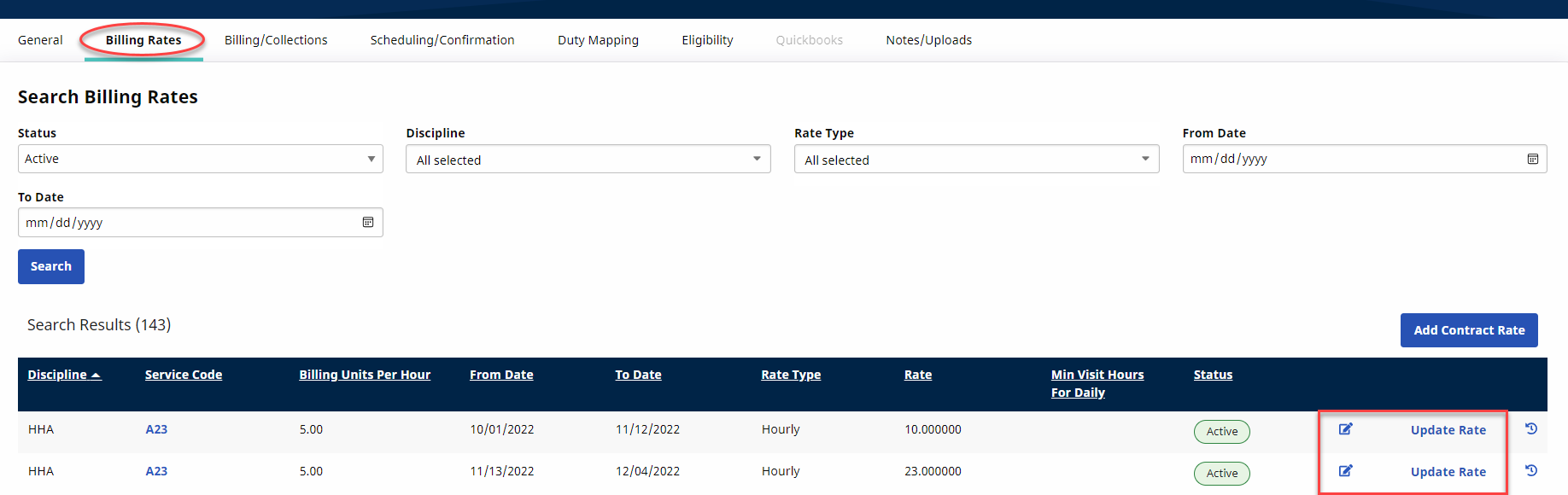 In the Billing Rates tab, the edit icon and Update Rate buttons are enabled if the Payer allows the Provider to update rates. As stated in the Patient Rates Page section, rates can also be managed (controlled) in the Billing Info tab for a UPR visit, and in the Contract Setup/Billing Rates tab.