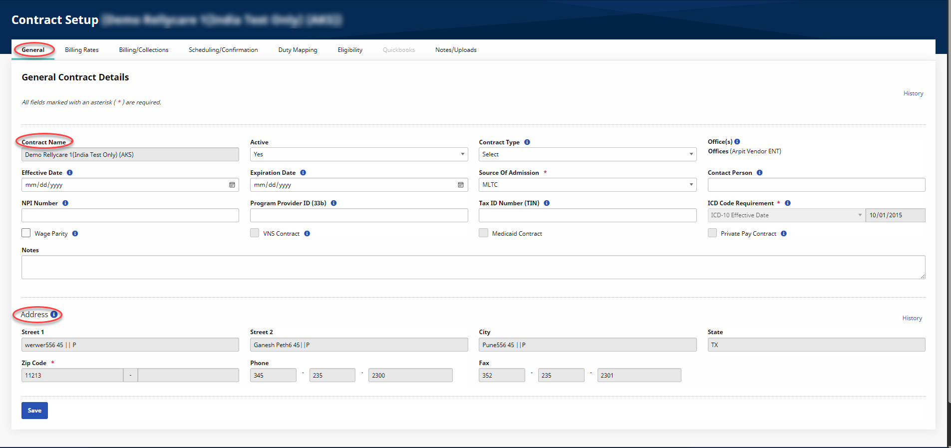 In the General tab, the following fields are read-only for Providers: Contract Name, Offices, ICD Code Requirement, and the entire Address section.