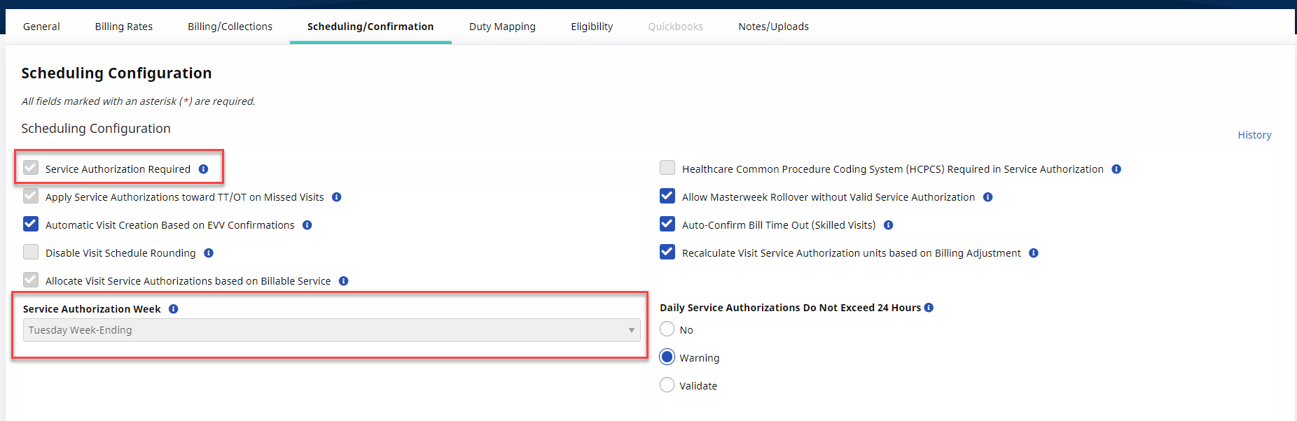 In the Scheduling/Confirmation tab, various fields are unavailable for Providers to edit. In the Scheduling Configuration section, the Service Authorization Required checkbox is preselected and the Service Authorization Week field is hard-coded for all UPR Linked Contracts as a standard.