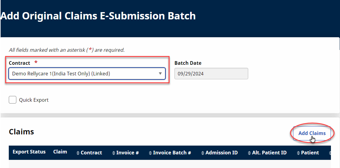 The Add Original Claims E-Submission Batch page opens. Select the Contract and click the Add Claims button.