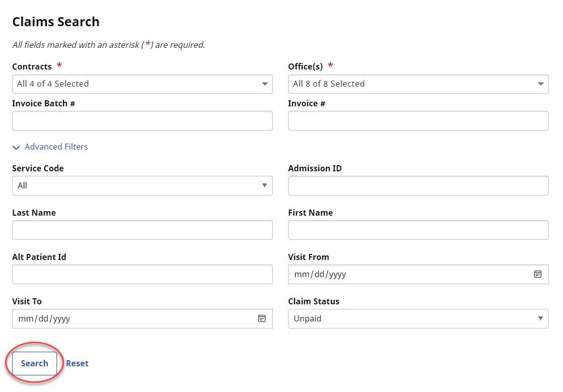 Go to Billing > New Invoice - (Internal) to generate a New Invoice Batch. Search for a specific visit using the filters or click on Search to generate all results.