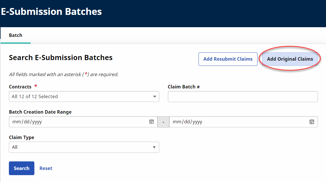 On the Search E-Submission Batches page, select the UPR Linked Contract from the Contract field and click the Add Original Claims button.