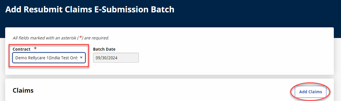 The Add Resubmit Claims E-Submission page opens. Select Contract and Add Claims.