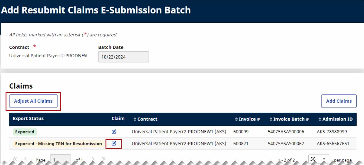 On the Add Resubmit Claims E-submission Batch page, click on the edit icon to open the Claims Adjustment window for the selected claim. To adjust all claims in the batch, click the Adjust All Claims button above the table.