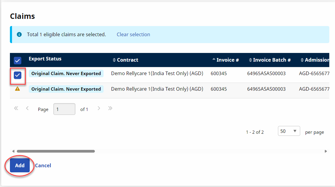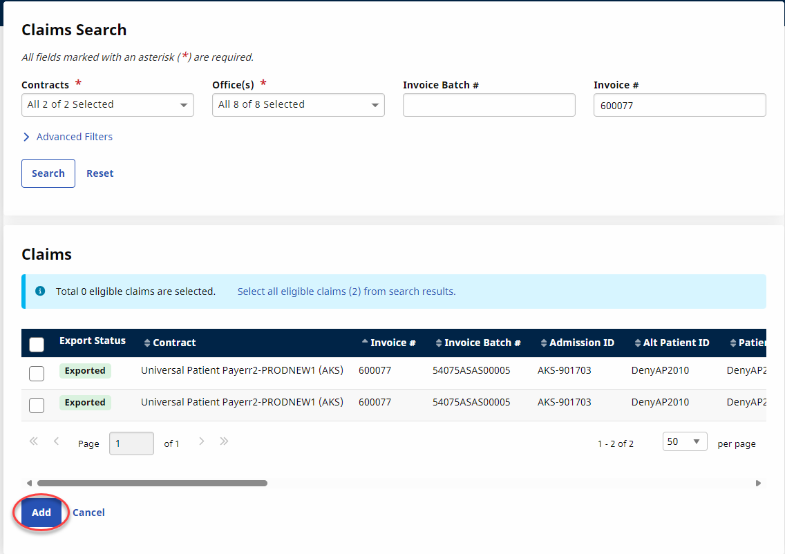 On the Claim Search page, select the applicable batches and click the Add button.