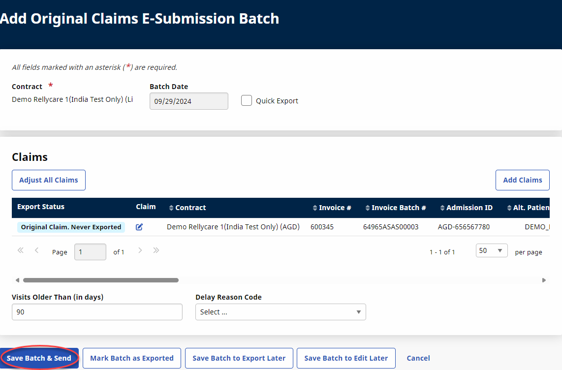 The claims appear on the Add Original Claims E-submission Batch page. Click on the Save Batch & Export button to send the claims to the SFTP to be picked up by the Payer system via the overnight process.