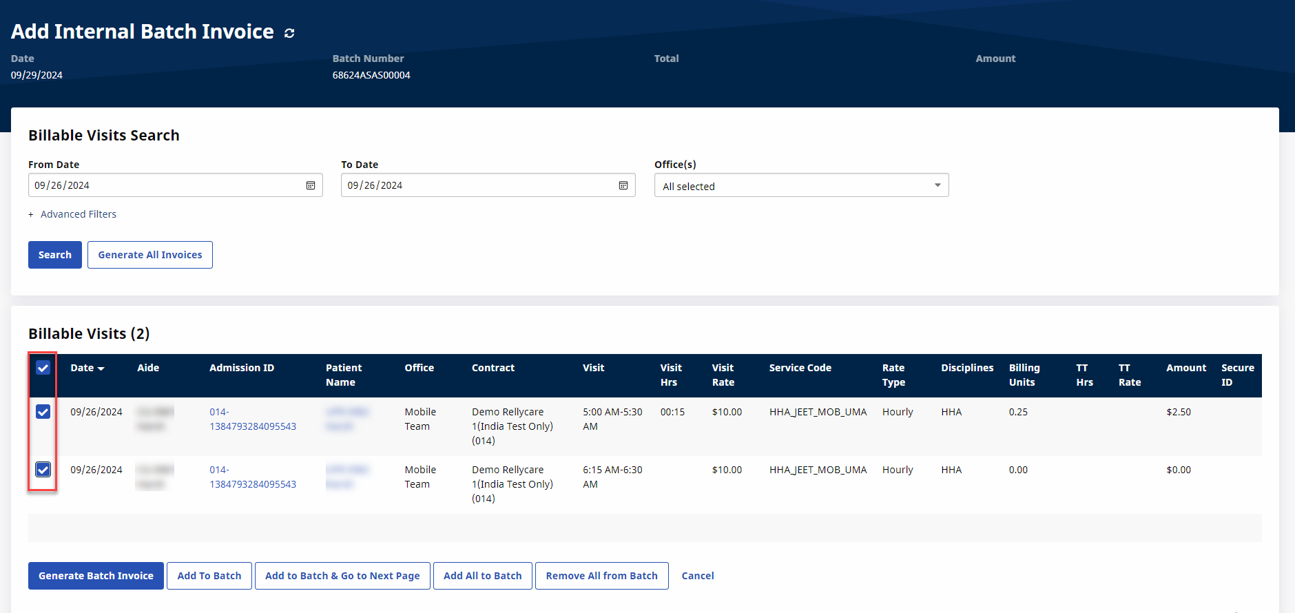 Select the visits to invoice and click the Generate Batch Invoice button.